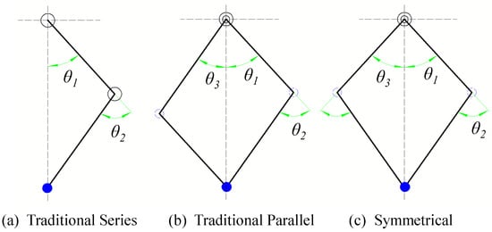 The leg mechanism plays an important role in the kinematic and dynamic characteristics of robots. We have given the definition of different legs using the example of a single leg with two DoFs in detail [20]. As shown in Figure 1a–c, the leg rod driving modes of different types are distinct. To compare the load capacity of the candidate leg, we calculate the required torque of the two driving joints under the same leg length configuration and external force. By deriving the forward kinematics of different structures, their foot positions can be expressed uniformly using the joint angle and length of leg rods; the relationship between the joint torque and the foot-end force f can be expressed uniformly, as shown in Equation (1):