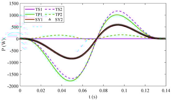 We calculated the required joints’s powers of the three legs during the same motion (vertical jump within 0.14 s) and assumed that the leg rods have no mass. As shown in Figure 2, the maximum instantaneous powers required by joint TS2 and TP1 are 1685 W and 1786 W, respectively, and the joint TS1 and TP2 are not more than 200 W. However, the powers of the joint SY1 and SY2 in the whole process are completely equal because the structural feature of symmetrical leg and the connecting rods on the left and right sides are completely symmetrical, so their torques and speeds are also equal. The peak powers of the two joints of the symmetrical leg are approximately 845 W, which is approximately half of the peak powers of the other two legs.