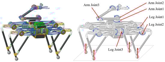 The manipulator was attached to the front-middle of the quadruped robot [12,13], which can be used as the fifth leg or to remove debris from the ground, and the workspace is in front of the robot in this configuration. In this paper, the manipulator was designed, which has six active driving joints (including gripper driving) tailored for our quadruped robot, as shown in Figure 3. Furthermore, the whole mass of the manipulator is about 8 kg, as its compact in design and light in weight, and the mass of ME is about 3 kg. The manipulator was connected to the middle of the upper surface of the robot’s torso similar to a backward elbow. The advantage is that the manipulator weight is shared by four front legs, and the manipulator has a large movement space above the robot, which can realize the object movement and operation tasks on the desktop.