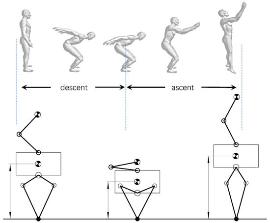 Then, we analyzed the decomposition of human upper and lower limbs movement in the whole process of vertical jumping. As shown in the image above Figure 5, in the descent stage, the experimenter squatted from the natural standing state to the initial position of jumping, and the arm swings back from the natural drooping. In the ascent stage, the arm swings counterclockwise around the shoulder joint during the rise of the torso. At the moment of leaving the ground, the leg extends to the maximum length, and the end of the arm swings above the shoulder joint.