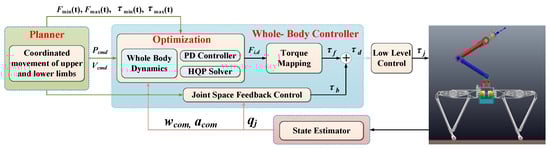 The simplified dynamic model of the system is described above, as shown in Equation (5). The simplified model combined with the planned trajectory and motion optimization based on hierarchical optimization obtains the optimized target variables , which includes the six-dimensional force acting on the torso and the torque of the six joints from the manipulator, and the latter can be used as the input of low-level control directly. At the same time, we need to map the virtual six-dimensional force acting on the torso in the operational space to the joint space of the robot’s legs. Firstly, we obtain the optimal distribution of GRFs through Equations (14) and (15), then map the force to the corresponding joint through the leg’s Jacobian matrix .