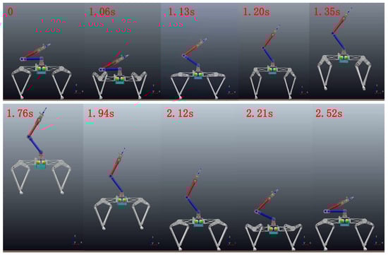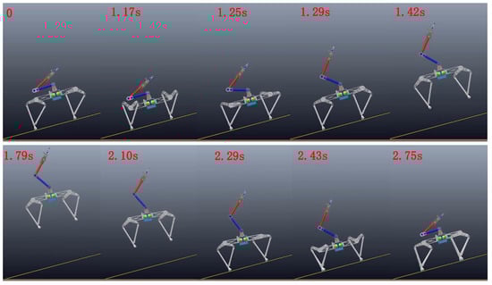 This section presents the simulations and results performed for the jumping motion of the quadruped robot with a manipulator based on the proposed methods, and the CoppeliaSim dynamic software was used to simulate the jumping motion. The Earth environment with the largest gravitational acceleration was chosen to verify the advantages of the take-off maneuver proposed in this paper. The physical parameters and simulation settings are shown in Table 2.