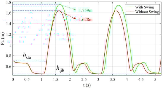 The actual net jumping height of torso is the difference between the maximum jumping height and . It can be seen from Figure 8 that the maximum values of torso height are 1.759 m and 1.628 m, respectively. The net jump heights are 1.009 m and 0.878 m, respectively, with and without arm swing. In fact, the highest point of ME relative to torso is when added the arm swing, and this value is when there is no arm swing, so the relative height of ME is: . Furthermore, the jumping height of the whole CoM is: . Therefore, the jump height increases by 19% after adding arm swing.