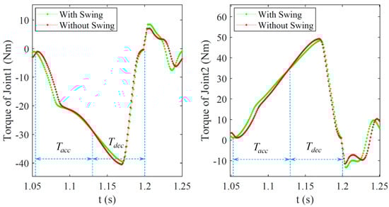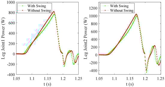 In order to further analyze the impact of arm swing on jumping performance, we analyzed the torque and power of the key leg Joint1 and leg Joint2, as shown in Figure 3. The curves in the take-off phase were analyzed to make a clearer representation, and the take-off stage (0.14 s) was divided into acceleration stage : 1.06–1.13 s) and deceleration stage : 1.13–1.2 s). The dividing point is 1.13 s, where the upward acceleration of the ME is 0. The torque change of the leg joints during the jumping process is shown in Figure 9. The leg joint torques in are greater than that without swing because the leg needs to overcome the reverse thrust from the upper limb. However, the ME generates upward pull force on the torso in , and the leg joint torques are less than that without swing, which verifies the theory in Section 3. At the same time, the joint output powers calculated according to Equation (3) were compared, as shown in Figure 10. The peak powers of leg Joint1 are 770 W and 816 W, and the peak powers of leg Joint2 are 998 W and 1043 W with and without arm swing, respectively. Due to the upward pull of ME during the deceleration phase, the leg’s load is reduced, so the required peak power is reduced. In addition, the peak powers of Joint1 and Joint2 are not equal, which is due to the additional supporting foot parts in the structural realization of symmetrical legs, as shown in Figure 7, resulting in incomplete symmetry in the leg structure.