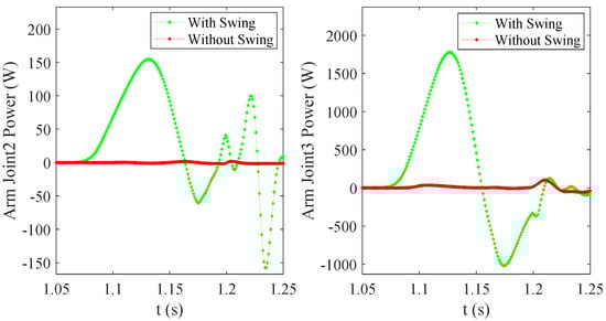 We also analyzed the power of the key Joint2 and Joint3 from arm in the jumping process with arm swing, as shown in Figure 3. As shown in Figure 11, the peak powers of arm Joint2 and Joint3 are 157 W and 1776 W, respectively. The peak power of Joint3 is larger, and the characteristics of this joint are larger torque and relatively smaller speed, which can be realized by selecting a high reduction ratio driving module. Furthermore, its characteristics meet the joint performance requirements of the manipulator operation tasks.