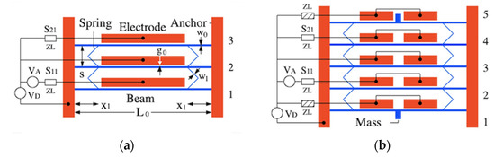 Band-pass coupled-beam filters: (a) 3-beam system and (b) 5-beam system with compensating springs, mass-loaded end beams and split electrodes. Red—fixed parts; blue—movable parts.