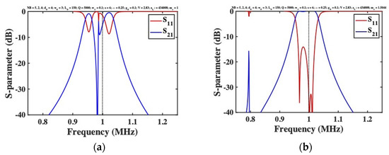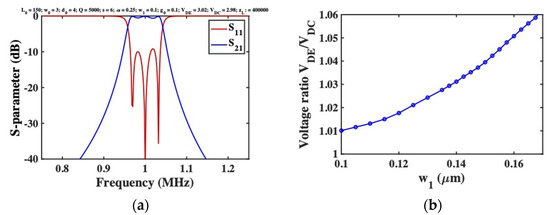 DC voltages and were first applied to the end and central beams to achieve tuning at a design frequency of , as and , below the snap-down voltage of . The impedance was then adjusted to achieve matching, as . Figure 2a shows the resulting variation of the S-parameters with frequency. Apart from the high value of (a known feature of coupled beam devices [21,47]), high performance is obtained; the response is bandpass, with correct tuning and broadband matching. However, determination of the DC voltages is a laborious process, which must be repeated each time parameters change. For example, Figure 2b shows the extracted variation of with the width of the linking springs, likely to vary in production. The ratio is not constant, implying that both voltages must be continually rediscovered. Similar effects occur if the electrode gap is altered, and even minor departure from suitable voltages leads to an unrecognisable response or failed simulation.