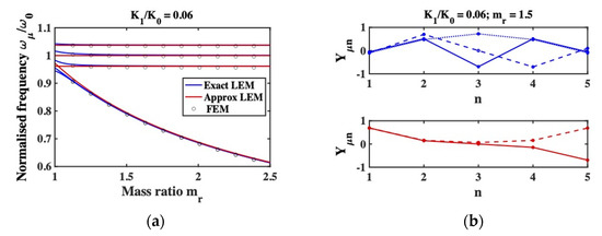 To confirm these arguments, the blue lines in Figure 4a shows the variation with of the exact resonant frequencies, for an array with example parameters . The red lines show the approximate resonant frequencies. As rises, the exact solutions tend to the approximations, and resonances predominantly involving the outer masses separate from the remainder. Figure 4b shows the mode amplitudes for and . The blue traces show the first set of modes while the red traces show the second. As predicted, the former is approximated by Equation (15), while the latter mainly involve the outer masses. Provided only the first modes are excited, the array behaves as if the outer masses are stationary, as shown in Figure 3b.