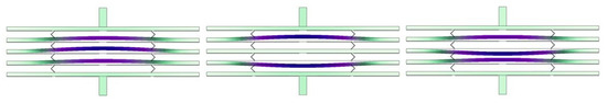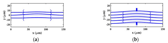 Several difficulties remain. Coupling must be weak to achieve a bandwidth suitable for applications such as intermediate frequency (IF) filtering. Mechanical coupling elements must then be nanostructured [43,44,45,46]. Electrode gaps must also be very small for realistic input and output impedance, further complicating fabrication [47,48,49,50]. However, a more fundamental difficulty exists. In a system of two mechanically coupled beams, the modified resonant frequencies of the two beams are inherently matched, because the effects of the coupling springs on each beam are identical. However, in high-order filters, which require more than two beams, the inner beams experience the stiffness modification of a different number of coupling springs to the outer beams. The suspension needed to ensure equal DC deflection (and hence equal electrostatic tuning) then no longer yields a synchronous AC response. Electrostatic stiffness modification is thus incompatible with the dynamic synchronization needed for correct collective operation of the array. The effect can be compensated by applying different DC tuning voltages to the inner and outer beams [17]. Unfortunately, it is difficult to establish the voltages needed even in simulation, using either the finite element method (FEM) [51,52,53], which involves accurate results using lengthy run times, or the stiffness matrix method (SMM) [54,55,56,57], which provides approximate results very quickly. The need for multiple DC voltages may present even more problems in production if tuning is needed to compensate for fabrication variations.