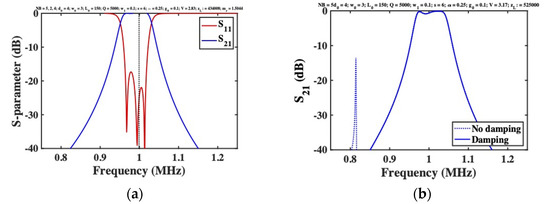 All the results presented here were compared with the predictions of the LEM, and excellent agreement was obtained in each case. The responses shown in Figure 7b and Figure 8a were also reproduced using the FEM. Figure 8b shows the frequency dependence of for a 5-beam system with mass-loaded end beams, obtained using COMSOL with and without end-beam damping. Apart from a minor difference in the tuning voltage (attributed to approximation of the transducer in the SMM), and minor passband ripple (which reduces with or ), the results are as expected. A bandpass response is obtained, and end-beam resonances are effectively suppressed by damping.