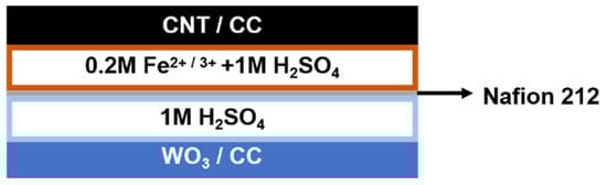The as-prepared CNT/CC and WO3/CC with a size of 3 × 8 mm2 were used directly as electrodes to assemble the asymmetric capacitor, where the positive half-cell compartment was the CNT/CC electrode in 0.2 M Fe2+/3+ + 1 M H2SO4 electrolyte, and the negative one was the WO3/CC electrode in 1 M H2SO4 electrolyte. The two different half-cell systems were separated by a Nafion 212 proton-exchange membrane. The resultant ASC device with a configuration of CNT/CC/0.2 M Fe2+/3+ + 1 M H2SO4//1 M H2SO4/WO3/CC is shown in Figure 1.
