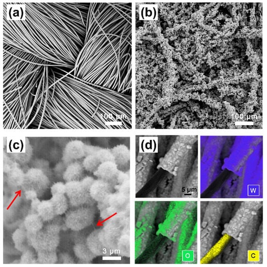 SEM images of (a) CC; (b,c) WO3/CC; and (d) element distribution of W, O, and C on the WO3/CC electrode.