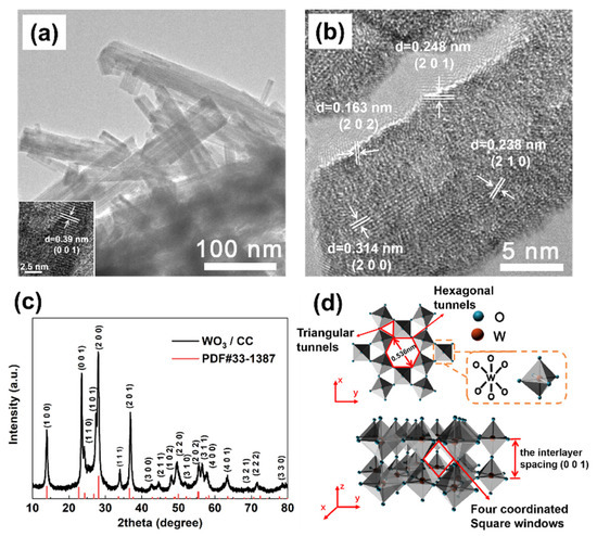 (a,b) TEM images of WO3; (c) XRD pattern of WO3/CC; and (d) the schematic crystal structure of hexagonal WO3.