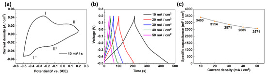 The electrochemical performance of the WO3/CC electrode was evaluated by both CV and GCD tests with a three-electrode system. Figure 4a shows the CV curve of WO3/CC at 10 mV/s, where two pairs of reversible redox peaks appear at −0.24 V (peak I), 0.08 V (peak II), −0.17 V (peak II’), and −0.43 V (peak I’). These peaks can be attributed to the two-step electrochemical redox-reaction process of the WO3, including the proton diffusion kinetics in the layered structure of the WO3 [32,33]. The electrochemical reaction involved in the process can be assigned as: . The GCD curves of WO3/CC at different current densities were shown in Figure 4b, and the corresponding specific capacitance values were calculated and plotted in Figure 4c. The specific capacitance of WO3/CC was 3400 mF/cm2 at 10 mA/cm2, and it remained at 2571 mF/cm2 at 50 mA/cm2. The high capacitive performance of the electrode can be attributed to the great affinity of the WO3 to the hydrophilic CC, leading to the strong adhesion of the WO3 nanobelts to the CC current collector. Therefore, the as-prepared WO3/CC can be used as an excellent negative electrode in asymmetric supercapacitors.