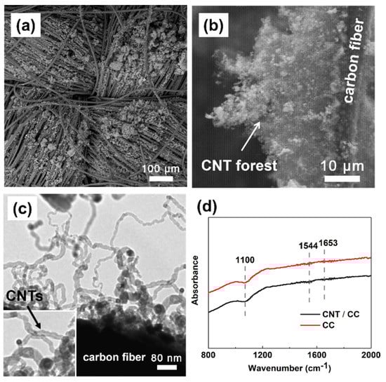 (a,b) SEM and (c) TEM images of CNT/CC; and (d) FTIR spectrum of CC and CNT/CC.