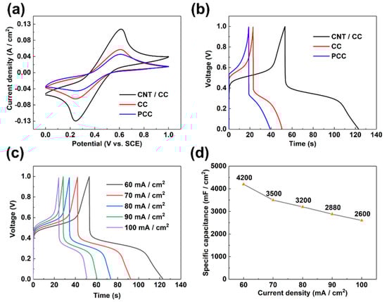 The electrochemical behavior of PCC, CC, and CNT/CC electrodes in 0.2 M Fe2+/3+ + 1 M H2SO4 electrolyte. (a) CV curves of PCC, CC, and CNT/CC electrodes at 10 mV/s; (b) GCD curves of PCC, CC, and CNT/CC electrodes at 60 mA/cm2; (c) GCD curves of CNT/CC electrode at various current densities; and (d) the specific capacitance of CNT/CC electrode at various current densities.