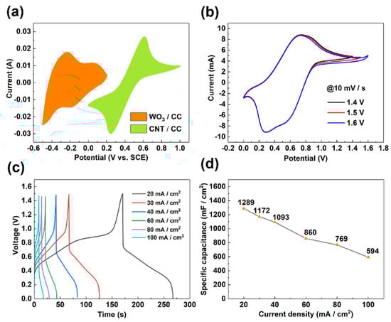 - Shinde, P.A.; Seo, Y.; Ray, C.; Jun, S.C. Direct growth of WO3 nanostructures on multi-walled carbon nanotubes for high-performance flexible all-solid-state asymmetric supercapacitor. Electrochim. Acta 2019, 308, 231–242. [Google Scholar] [CrossRef]