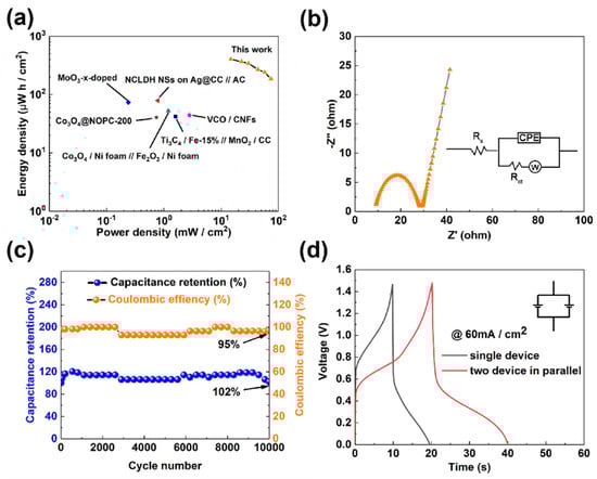 The Ragone plot in Figure 8a displays the energy density and power density of the ASC device, which is calculated from the GCD curves at various current densities in Figure 7c. Significantly, the ASC device exhibits an energy density as high as 403 μW h/cm2 (27 m Wh/cm3) at a power density of 15 mW/cm2 (992 m W/cm3), and it still maintains 186 μW h/cm2 when the power density is as high as 74 mW/cm2. As shown in Figure 8a, the value is much higher than that of other asymmetric supercapacitors reported previously [36,37,38,39,40,41]. The Nyquist plot of the device in Figure 8b shows an equivalent series resistance (Rs = 8.5 Ω), which is lower than the reported result [27], and the measured charge-transfer resistance (Rct = 19.49 Ω) may be caused by the existence of the proton exchange membrane. In addition, the multi-cycling test, shown in Figure 8c, manifests that the ASC device has a capacitance retention rate of 102% after 10,000 cycles. At the same time, its corresponding coulombic efficiency is still as high as 95%, indicating that the device exhibits excellent stability. The remarkable cyclic stability could be due to the hierarchical structure of both the electrodes, which causes the gradual infiltration of the redox-active Fe3+/2+ into the entangled CNTs on the CC in the positive half-cell during the long-term cycling process, and the progressively expanding percolation of the small proton into the multi-tunnel crystalline structure of the h-WO3 nanobelts in their self-assembled, urchin-like microspheres in the negative part, as shown in Figure 3d. Moreover, after the parallel connection of two ASC devices, the charge and discharge time of the corresponding GCD curve in Figure 8d increases significantly, which proves that our ASC device has the potential for practical application.