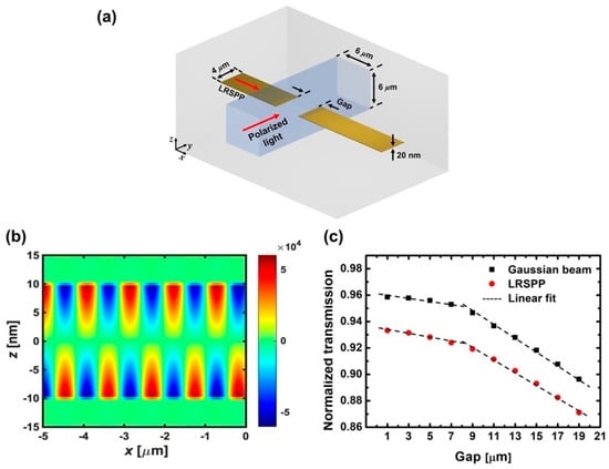 To investigate why the transmission is lowered by the broadening of the Gaussian beam, the tunneling of LRSPPs across the gap and the coupling of LRSPPs by a Gaussian beam are compared. Figure 1c shows the FDTD-calculated transmission of LRSPPs at the output SPPW in the absence of an input optical signal across the gap. The red dots represent the transmission of the LRSPP when excited in the input SPPW (SPP-photon-SPP), and the black squares represent the transmission of the LRSPP when excited in the output SPPW after the radiation of the Gaussian beam in the gap. Without the input SPPW, the Gaussian beam is launched from the position of the end-facet of the input SPPW and thereby excites the LRSPP at the front-facet of the output SPPW (photon-SPP). The black dashed lines represent the linear trends of the transmission. The transmission is lowered linearly as the gap length increases. However, The slope which is the ratio of the transmission’s change to the gap length’s increment becomes steeper over the gap length of 8 μm for both cases as in G-SPPWs without the channel waveguide [,], due to the mode size mismatch between the diverging radiation mode and LRSPPs at the front-facet of output SPPW, increasing the photon-SPP coupling loss.