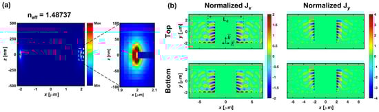 The FDTD analysis of (a) the photonic mode excited by TM-polarized light in the gap and (b) induced current densities (Jx and Jy) at the top and bottom interfaces of G-SPPWs after normalization to the current density of the LRSPP. Note that the scale of color bar is different with Figure 2b.