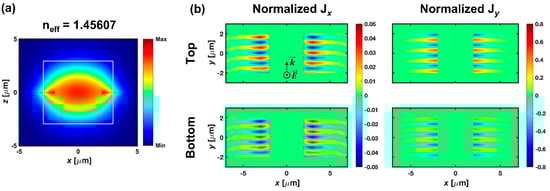 On the other hand, TM-polarized light exhibits quite a different response in the gap. The magnetic field of TM-polarized light excited in the channel waveguide oscillates parallel to the planar plane of PSC, and the electric field mainly oscillates in the z-axis. Figure 3a shows the cross-sectional mode profile of the excited mode in the gap by TM-polarized light, and the white solid line represents the 6 × 6 μm2 core of the channel waveguide. Most of the field is distributed in the core with a refractive index of 1.46. The mode profile is almost the same; the fundamental TM mode is excited in the channel waveguide and the effective index is 1.45607, which indicates that a photonic TM mode guided by the core is excited in the gap. Figure 3b shows the induced current density by the photonic mode at the top and bottom interfaces of G-SPPWs. Compared to the TE-induced current density, minute amounts of current density are induced, and the normalized value is also under 1, which implies that TM-induced current density cannot disturb the propagation of LRSPPs; therefore, all the power contained in incidental TM-polarized light passes across the gap in the photonic state without any disturbance to the LRSPP.