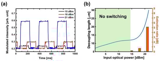 (a) Generated plasmonic signals by TE-polarized optical signals with the power of 15, 18 and 21 dBm in PSC. (b) Comparison between the calculated decoupling length and measured extinction ratio as a function of input optical power.