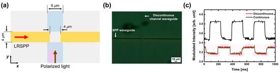 We also investigated the dielectric effect on the PSC through the discontinuity of the channel waveguide. Figure 5a illustrates the top view of the PSC with a discontinuous channel waveguide and Figure 5b shows the optical microscope image of the fabricated PSC sample with a discontinuous channel waveguide. For such a structure, partial reflection and scattering occur at the end(front)-facet of the input(output) channel waveguide, and the effective index of excited edge plasmon in the gap is changed depending on the surrounding dielectric material. Figure 5c shows the copied plasmonic signals from TE-polarized optical signal with the power of 21 dBm for the continuous and discontinuous channel waveguides. It is found that the extinction ratio for the continuous channel waveguide is much larger than that of discontinuous one. The FDTD-calculated transmission of input light at the output channel waveguide does not exhibit distinct differences between the cases, which means that the reflection and scattering at the facets of the discontinuous channel waveguide do not affect the transmission of LRSPPs across the gap, due to the small index change. However, there is a significant difference observed in the excited edge plasmon mode. The effective indices of edge plasmon modes excited by the TE-polarized light in the gap for the continuous (discontinuous) channel waveguides are 1.48737 (1.48344). Due to the permittivity change of surrounding dielectric material and the power ratio of excited edge plasmon to the input optical power, Pedge/Pinput is 1.0084% for the continuous channel waveguides and 0.7867% for the discontinuous channel waveguides. Since the input optical power is the same for both cases, there are significant observable changes in the excited edge plasmon mode. Therefore, it is found that the transmission of LRSPPs across the gap is affected by the TE-induced edge plasmon, depending on the excited power of edge plasmon in the gap. This also explains the reason why a significantly larger input optical power is required to suppress the transmission of LRSPPs in a PSC. Therefore, it would be possible to improve the plasmonic signal generation efficiency by introducing plasmonic nanostructures so that more power is transferred to free electrons in order to excite the edge plasmon and induce a strong electric current parallel to the SPP propagation, reducing the overall power consumption.