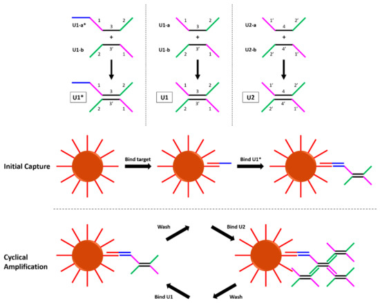 In response to these challenges, non-enzymatic NATs have been developed which amplify a target-induced signal using only thermodynamically-driven DNA hybridization reactions. Examples include hybridization chain reaction, entropy-driven catalysis, and catalyzed hairpin assembly [7,8,9,10]. These tests overcome the obstacles posed by enzymes, but typically have sub-optimal sensitivity due to their poor amplification. There have been several interesting demonstrations of non-enzymatic NATs that achieve increased sensitivity via exponential growth, including cascaded catalyzed hairpin assembly [11], branched or hyperbranched hybridization chain reaction [12,13], and dendritic amplification [14], but perhaps the most promising is the recent demonstration of a dumbbell DNA amplification scheme [15]. Each DNA dumbbell, shown in Figure 1, has four binding domains which bind the opposite dumbbell. The original authors performed the amplification assay by capturing target DNA on magnetic beads and sequentially incubating the beads with U1, then U2, then U1, etc. Over the course of 35 dumbbell incubations, a limit of detection of 5 copies/reaction was reported; this far surpasses limits of detection typical of other non-enzymatic NATs.