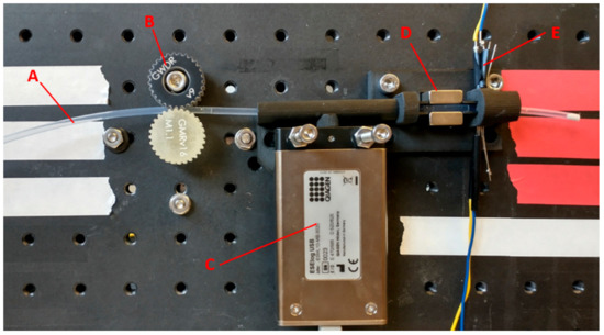 Photograph of the autoPiLOT reaction processor. Microfluidic polymer tubing (A) contains the reaction solutions. Two gears (B) controlled by a stepper motor move the tubing. A fluorometer (C) measures the fluorescence on the beads inside a light-tight chamber. Two neodynium magnets (D) hold the magnetic beads in their field. An IR sensor/receiver pair (E) detects the liquid/air interfaces in the tubing.
