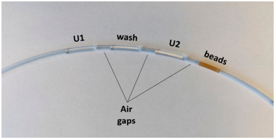 The microfluidic FEP tubing was loaded with the following fluid chambers, each separated by a small air gap approximately 1 cm in length: 100 µL U1 at 250 nM, 100 µL hybridization buffer, 100 µL U2 at 250 nM, 100 µL magnetic bead solution. To load a fluid chamber into the tubing, the liquid was pipetted directly into the tube with the pipette tip flush against the opening. The tubing was then gently tipped to move the fluid chamber further along, clearing room for the next solution to be inserted. After the four fluid chambers were loaded in the tubing, both ends were sealed with Cha-seal tube sealing compound. The loaded tube (shown in Figure 3) was run on the autoPiLOT to move the magnetic beads back and forth between the two dumbbell solutions, reading fluorescence on the beads in the wash chamber after every other dumbbell incubation. The total reaction time was a function of the number of dumbbell incubations; 15 incubations on the autoPiLOT took approximately 8 h (15 incubations × 0.5 h/incubation, plus the time to move the beads back and forth between chambers).