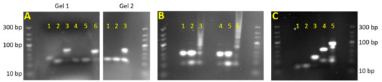 Gel electrophoresis results for D-DNA dumbbell binding studies. The same DNA ladder is used throughout, and shown at the right and left sides of each gel. (A) Gel 1, lanes 1-3: U1-a*, U1-b, and U1*. Gel 1, lanes 4-6: U1-a, U1-b, and U1. Gel 2, lanes 1-3: U2-a, U2-b, and U2. (B) Lanes 1–3: U1, U2, and U1+U2. Lanes 4–6: identical, but with 5′ FAM fluorescent labels. (C) Lane 1: capture probe. Lane 2: target. Lane 3: capture+target. Lane 4: U1*. Lane 5: capture + target + U1*.