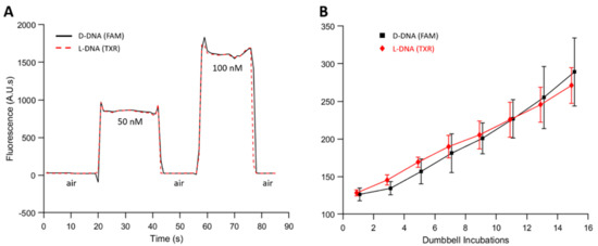 After validating the D-DNA dumbbell binding events, the previous experiments were repeated using left-handed DNA. The L-DNA sequences are completely identical, the only differences are the chirality of the nucleotide bases and the replacement of FAM with Texas Red. As expected, the results (Supplementary Materials) show that the L-DNA dumbbells exhibit the same behavior as the D-DNA; the dumbbells assemble from their single-stranded components and bind to each other to form large dumbbell networks.