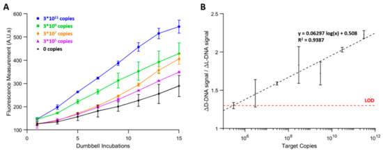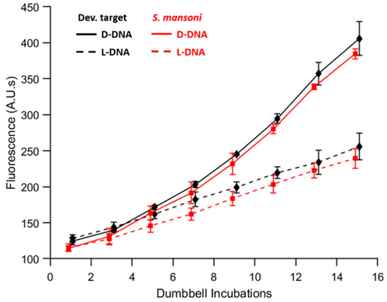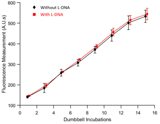 Finally, autoPiLOT amplification was compared between samples with and without L-DNA dumbbells included. Samples contained 3*1011 copies of target to ensure that amplification was high, and any differences in performance caused by the presence of the L-DNA would be exaggerated. Over the course of 15 dumbbell incubations, the D-DNA amplification (shown in Figure 7) was found to be identical according to two-way ANOVA, α < 0.05, regardless of whether or not L-DNA dumbbells have been included. The parallel L-DNA dumbbells exhibit two key traits: they amplify at a rate equal to the non-specific amplification of the D-DNA dumbbells, and they do not impact the amplification of the D-DNA dumbbells. These findings demonstrate the utility of a dual-chirality design as a means to measure both target-induced amplification and non-specific amplification in a single reaction.
