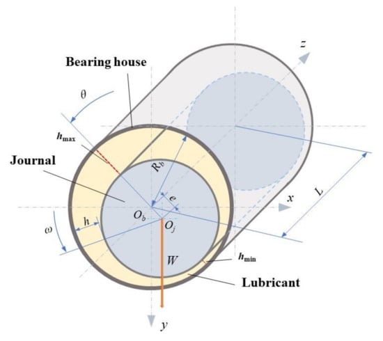 The structure of HJB is displayed in Figure 1. The lubricant film filling in the clearance between the surfaces of journal and bearing house is marked. When the journal starts to rotate in the anticlockwise direction, the lubricant continuously accumulates in the convergent wedge, leading to the increase of pressure adjoining the minimum lubricant thickness position. After the journal speed reaching a certain value, the position of journal is shifted to right, the pressure resultant force generated by lubricant film is balanced with load W.
