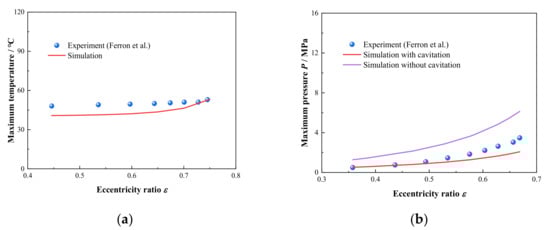 As is shown in Figure 5, the comparison between the maximum temperature and pressure versus eccentricity ratio from the experiment data in literature [] and numerical results simulated by model in this paper at ω = 2 × 103 rpm and ω = 4 × 103 rpm, respectively, the relevant calculation parameters are shown in Table 3. For the maximum temperature displayed in Figure 5a, the predictions of the model are in good agreement with experiment results. In addition, the maximum pressure is shown in Figure 5b, it can be seen that the tendency of the predicted results with considering cavitation function are in better consistence with experimental data than those without considering. Therefore, it can be concluded that the THD model containing the interactions between the lubricant viscosity and temperature and the function of cavitation can well exhibit the flow and thermal characteristics of lubricant film in HJB.