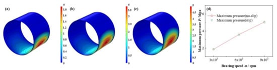 Comparison of the pressure distribution under different bearing speeds. (a) ω = 3 × 103 rpm; (b) ω = 6 × 103 rpm; (c) ω =9 × 103 rpm; (d) minimum pressure.