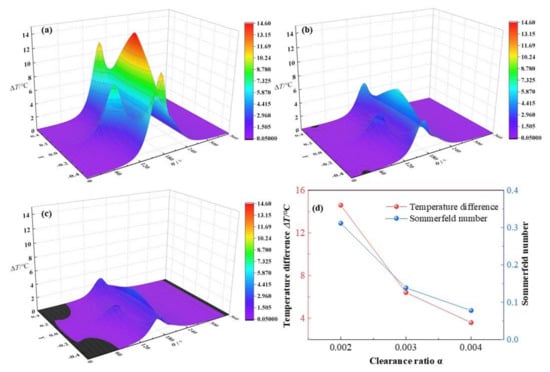 In this section, the clearance ratio α will increase from 0.002, 0.003 to 0.004, whereas other parameters are kept as C0 = 180 μm, ω = 3 × 103 rpm, ε = 0.7, L/D = 0.83. It is depicted in Figure 22 that with the increase of clearance ratios α, the dimensionless maximum temperature difference of lubricant film declines from 14.6 °C, 6.41 °C to 3.59 °C, respectively, with a reduction rate of −75.4% in all. The maximum temperature of lubricant film decreases rapidly with the growth of the clearance ratio.