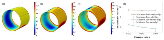 Comparison of the flow rate distribution under different eccentricity ratios. (a) ε = 0.3; (b) ε = 0.5; (c) ε = 0.7; (d) maximum/minimum flow rate.