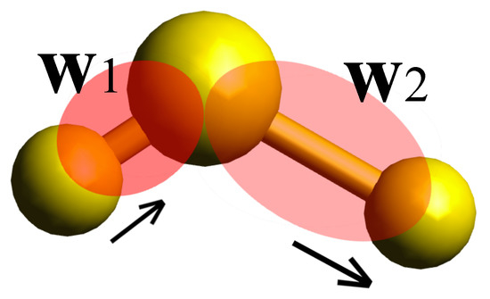 As the Wannier functions are usually centered on bonds in covalent systems, the dynamics of the Wannier spreads give a clear picture of changes in the bond polarizability. Therefore, by calculating the autocorrelation of an individual Wannier polarizability via an AIMD simulation, one can obtain the contributions of bond stretching modes to the total spectrum. Similarly, the frequencies corresponding to bending, scissoring, wagging, and even those modes with higher participation ratios can be obtained by including two or more Wannier functions in Equation (5). For the calculation of individual stretching modes, only the self-correlation term in Equation (6) is required. However, in cases where two or more Wannier polarizabilities are included, the cross terms become important for the correct assignment of the peaks. Assuming that we are aiming for the assignment of symmetric and asymmetric stretching modes in a typical molecule, we need to include in Equation (5) the polarizabilities corresponding to two Wannier functions centered along two adjacent covalent bonds. This corresponds to set A ¯ = 1 3 A 1 + A 2 , where A 1 and A 2 are the polarizabilities corresponding to Wannier functions w 1 and w 2 (see Figure 1).