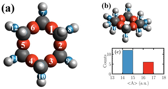 The red spheres correspond to the Wannier functions centered along C–C bonds, while the blue ones represent those along C–H bonds. The radii of the spheres are set according to the polarizability, which is shown in Figure 2c for the red and the blue spheres, respectively. As demonstrated, in the case of the molecule at hand, the Kohn-Sham eigenstates give rise to two types of Wannier functions which are distinguishable based on their polarizabilities. The frequencies of the fundamental vibrations of the simulated and experimental [36,37,38] Raman spectrum of a cyclohexane molecule in gas phase are listed in Table 1.