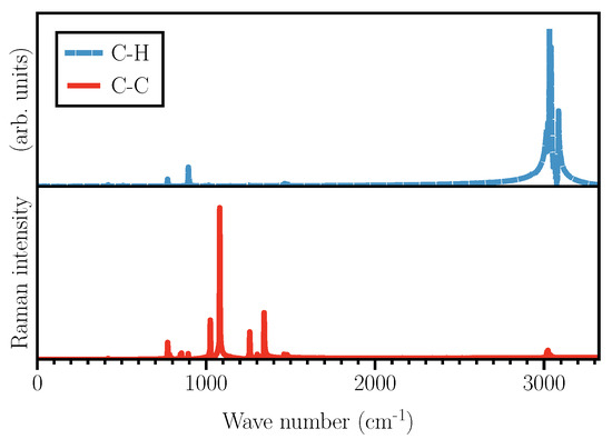 Figure 3. Simulated partial Raman spectra using Wannier functions along C–H (blue dashed) and C–C (red solid) bonds. Only the results obtained using just one Wannier function are shown for each type of bonds.
