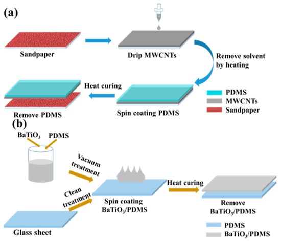The MWCNTs were purchased from Nanjing Xanano Materials Tech Co., Ltd., Nanjing, China with 95% purity, 10–30 m length, and 2.0 wt% carboxyl content. The MWCNTs were dispersed in anhydrous ethanol (AET) and stirred manually for 10 min. Subsequently, high-frequency ultrasound was used for 30 min to further disperse the MWCNTs to reduce the occurrence of agglomeration of the MWCNTs in the dispersion. Then, MWCNTs/AET dispersion with a mass fraction of 1 wt% was obtained. The dispersion solution was kept static for 12 h. Subsequently, the bottom precipitation was removed, and the supernatant was retained for further experiments. PDMS (Sylgard 184 model) was purchased from Dow Corning. The PDMS main agent and curing agent were mixed at a ratio of 15:1 and stirred for 30 min, and then they were processed under vacuum for 30 min to remove air bubbles in the mixed solution for later use. Eighty-mesh sandpaper (German Warrior brand) was purchased from a supermarket, cut, and affixed flat on a glass plate. BaTiO3 with a particle diameter of 500 nm and content of 99.5% was purchased from Beijing Shenghe Haoyuan Technology Co., Ltd. BaTiO3/PDMS-mixed solutions with a mass percentage of 0%, 10%, 20%, and 30% were prepared. The solutions were stirred for 2 h to remove air bubbles. Adhesive polyimide (PI) tape (50 µm thickness) was purchased from 3M Company.