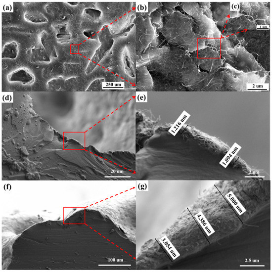 SEM image of the electrode layer. (a) The surface of electrode layer. (b) The MWCNTs layer. (c) Further amplification of the MWCNTs layer. (d) The cross-section of the bottom of the microstructure groove. (e) The thickness of the MWCNTs layer at the bottom of the microstructure groove. (f) The cross-section on the top of the microstructure bulge. (g) The thickness of the MWCNTs layer on the top of the microstructure bulge.