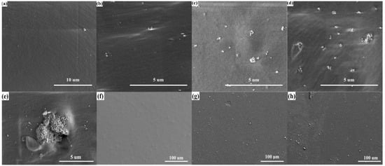 The preparation process is shown in Figure 1b. Four BaTiO3/PDMS mixed solutions with different contents were spin coated on the smooth glass sheet in sequence for 40 s at a speed of 400 rpm. After the spin coating was completed, the sample was heated at 70 °C for 3 h to cure the composite film. Finally, the composite film was peeled off from the surface of the smooth glass sheet. The surface of four dielectric layers was characterized using a scanning electron microscope (SEM). As shown in Figure 3a–d, the cross-section of the pure PDMS film was the smoothest, and the cross-section of the composite film with 10% BaTiO3 addition had sporadic BaTiO3 nanoparticles. Furthermore, there were more BaTiO3 nanoparticles in the cross-section of the composite film with 20% BaTiO3 addition, and BaTiO3 particles appeared as small agglomerates. The cross-section of the composite membrane with 30% BaTiO3 addition had more BaTiO3 particles distributed in the PDMS in the form of small agglomerates. Moreover, large BaTiO3 nanoparticle agglomerates were generated. We observed the presence of small aggregates in the cross-section of the composite film added with 30% barium titanate, as shown in Figure 3e. It can be observed that a large amount of barium titanate can accumulate and agglomerate together. If the BaTiO3 content was increased beyond 30%, a larger volume of BaTiO3 agglomerates appeared in the dielectric layer of the composite material. This considerably affected the stability of the sensor. Therefore, the maximum content of the dielectric layer composite material BaTiO3 in this study was set to 30%. We also characterized the surface of barium titanate film with the addition of 10%, 20%, and 30%, as shown in Figure 3f–h. It can be seen that there is no large-area barium titanate aggregation on the surface of the BaTiO3/PDMS film. This distribution of barium titanate is helpful to improve the dielectric constant of the dielectric layer.