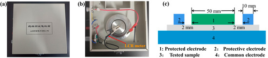 A three-electrode measurement system (Shanghai Anbiao Electronics Co., Ltd., Shanghai, China) was applied to measure the dielectric constant of the four dielectric layer samples. As shown in Figure 4a,b, the three-electrode measurement system mainly includes the protective electrode, the protected electrode, the common electrode and its accessories, the sample, and the shielding box. The equivalent diagram of a cross-section of the three-electrode measurement system is shown in Figure 4c. The three-electrode measurement system was made of stainless steel. The size parameters of the electrode are as follows: the diameter of the protected electrode was 50 mm, the diameter of the protective electrode was 74 mm, and the gap between the protected electrode and the protective electrode was 2 mm.