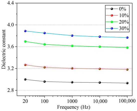 We connected the two test terminals of the LCR meter to the protected electrode and the common electrode, respectively, and measured the capacitance value () of the sample. The relative dielectric constant () of the tested sample could be calculated by Formula (6). The relative dielectric constants of the four samples with BaTiO3 content of 0%, 10%, 20%, and 30% are shown in Figure 5. The test curve indicates that the dielectric constants of the four samples decreased slightly with the increase in the capacitance measurement frequency. This may be because, when the test frequency is further increased, the change of the dipole vector is slower than that of the applied electric field, resulting in the weakening of polarization and the reduction in dielectric constant of the composites [30]. With the increase in the BaTiO3 content, the relative dielectric constant of the dielectric layer also increased. This may be because with the increase in the BaTiO3 content, the crosslinking degree of the composite material increases and the polarization enhances. Thus, in this study, 30% (mass fraction) BaTiO3 was added to PDMS to prepare composite dielectric layers.