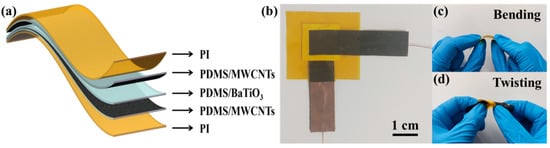 The fabricated MWCNTs/PDMS electrode layer was cut into a strip with a width of 1 cm and length of 4 cm, and the PDMS/BaTiO3 dielectric layer was cut into a square with a side length of 1.5 cm. The sensor thus adopted a “sandwich” structure, with the upper and lower layers being the electrode layers and the middle layer being a dielectric layer. The three-layer structure was sealed and bonded using a single-sided adhesive PI film. The schematic diagram of the sensor structure is shown in Figure 6a. A copper foil conductive tape was used to fix the wire on the surface of the electrode layer, making further testing and usage convenient. The actual image of the sensor is shown in Figure 6b. The thickness of the sensor was 1.05 mm, and the effective pressure sensing area was 1 cm × 1 cm. Images of the deformation states (such as bending and distortion) of the flexible sensor are shown in Figure 6c,d. It can be seen that the deformation type of sensor meets the demand of joint movement.