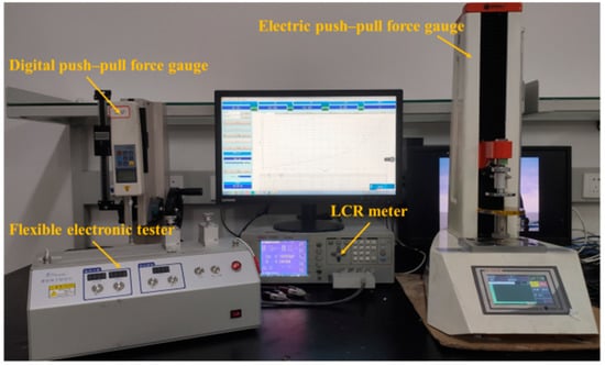 The surface morphology of the dielectric layer was characterized using the Apreo SEM (Thermo Scientific, USA). A digital push–pull force gauge (Adburg) and an electric push–pull force gauge (ZQ-990A) (Dongguan Zhiqu Precision Instrument Co., Ltd., Dongguan, China) were used to provide pressure loading for the sensor. A flexible electronic tester (Shanghai Mifang Electronic Technology Co., Ltd., Shanghai, China) was used to provide bending loading for the sensor. An LCR meter (TH2826) (Changzhou Tonghui Electronics Co., Ltd., Changzhou, China) was used to record the changes in electrical signals output by the sensor. The performance test device of the sensor is shown in Figure 7.