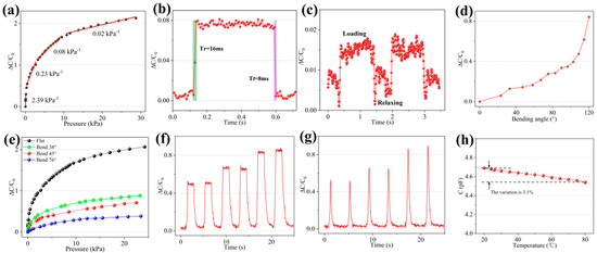 The sensor was fixed on the base of the digital push–pull force gauge. As pressure was applied, the LCR meter recorded the capacitance changes corresponding to different levels of pressure. Then, the pressure–capacitance change curve was obtained, as shown in Figure 8a. The piecewise linear fitting analysis shows that the sensitivity of the sensor was 2.39 kPa−1 in the pressure range 0–0.12 kPa, 0.23 kPa−1 in 0.27–2.68 kPa, 0.08 kPa−1 in 3.25–9.45 kPa, and 0.02 kPa−1 in 10.73–28.73 kPa. Thus, the sensitivity of the sensor gradually decreased as the pressure increased. This may be because the microstructure of the electrode surface is constantly compressed under the action of external forces, approaching the deformation limit. The air groove formed between the electrode layer and the dielectric layer almost disappeared due to compression. When the sensor was under high pressure, the microstructure of the electrode layer was close to the deformation limit and contributed little to the sensitivity. At this time, the dielectric layer was still within its elastic range, and could produce elastic deformation under high pressure, further reducing the distance between the upper and lower electrodes, resulting in a small output response of the sensor. To measure the response time and recovery time of the sensor more efficiently, a 200 mg weight piece was lightly thrown on the surface of the sensor to simulate transient pressure loading. Subsequently, tweezers were used to quickly move the weight piece away from the sensor to simulate pressure unloading. Figure 8b indicates that the response time (Tr) of the sensor was 16 ms when the weight piece was loaded, and the recovery time (Tf) of the sensor was 8 ms when the weight piece was unloaded. It was also found through experiments that, when a 50 mg weight piece was loaded on the sensor (with pressure approximately 6.8 Pa), the capacitance output of the sensor had a recognizable increase change, and the sensor could effectively maintain the change in the capacitance value. The response curve of the sensor pressure limit detection is shown in Figure 8c. The ratio of the capacitance change to the sensor’s initial value was approximately 0.015. Unfortunately, when the mass of the weight was less than 50 mg, the capacitance value change of the sensor was difficult to recognize owing to noise interference. Therefore, 6.8 Pa can be regarded as the minimum pressure resolution that the sensor can recognize. This also proves that the sensor has certain advantages in detecting extremely low pressure. To prove that the flexible pressure sensor can adapt to complex non-planar environments by virtue of its own flexibility, the sensor was fixed on the two splints of the flexible electronic tester. One of the splints was moved inward to make the sensor bend and arch, forming different angles. The test results are shown in Figure 8d. As the bending angle increased, the capacitance of the sensor gradually increased and the speed gradually increased. When the sensor was bent, the dielectric layer and the microstructure of the electrode surface were squeezed, thereby changing the initial capacitance value. To demonstrate the capability of the sensor responding to the pressure changes even in the bent state, the sensor was attached to the outer wall of 100 mL, 50 mL, and 10 mL graduated cylinders. At this time, the bending angles of the sensor were approximately 38°, 45°, and 76°, respectively. The sensitivity tests were performed on the sensors in the three bending states (Figure 8e). The results indicate that, compared with the sensitivity curve of the sensor in the flat state, the sensitivity of the sensor in the bent state is obviously lower. This is because the sensor was compressed when the sensor was bent, which increased the initial capacitance value of the sensor; that is, in increased, resulting in a decreased slope of the pressure–capacitance curve and a decrease in sensitivity. In the sensor bending test, the pressure response curve when the sensor was bent at 36° was the steepest, followed by the pressure response curve at 45°, and the pressure response curve at 76° was the flattest. This indicates that the larger the sensor bending angle, the higher is the initial capacitance value and the lower is the sensitivity of the sensor. To explore the sensor’s ability to detect different pressure loading signals, sharp pulse pressure and square wave pressure of signal values 0.3, 0.8, and 1.5 kPa were repeatedly applied to the sensor twice. As shown in Figure 8f,g, under the same applied pressure, irrespective of whether square wave pressure or sharp pulse pressure was applied, the corresponding capacitance output response value was almost the same. This indicates that the sensor has a stable response to different types of pressure signals. To analyze whether the sensor could work normally for a long period while generating heat or in a high-temperature environment, the sensor was placed in a vacuum drying oven and the temperature increased from 20 °C to 80 °C. Then, the capacitance change curve of the sensor during the heating process was measured, and the results are as shown in Figure 8h. It can be seen that the capacitance change of the sensor from 20 °C to 80 °C was only 3.1% of the initial capacitance value. Thus, the impact on the electrical performance of the sensor is small and the sensor meets the working requirements under high temperature.