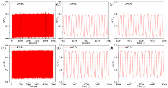 To show the durability and service life of the sensor, a cyclic pressurization–unloading test was performed on the sensor. The test pressure was 200 and 400 Pa, and the number of repetitions was approximately 2000 (Figure 9). As shown in Figure 9a,d, the capacitance response curves can maintain good stability at 200 and 400 Pa, indicating that the sensor has good repeatability under different pressure. As shown in Figure 9b,c and Figure 9e,f, at different time periods of 1000–1040 s and 4000–4040 s, the capacitance response curves are very close, and there is no consistent increase or decrease in the capacitance change. This proves that the sensor has good durability and creep resistance.